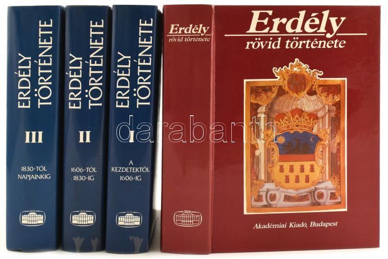 Erdély története. A kezdetektől napjainkig. I-III. köt. Főszerk.: Köpeczi Béla. Bp., 1988, Akadémiai Kiadó. Harmadik kiadás. Kiadói egészvászon-kötés, kiadói papír védőborítóban. + Erdély rövid története. Főszerk.: Köpeczi Béla. Bp., 1989, Akadémiai Kiadó. Kiadói kartonált papírkötés.