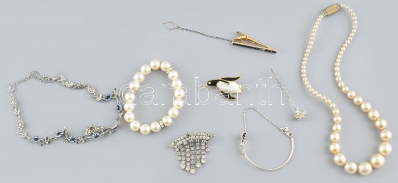 Leírás: Kis vegyes bizsu tétel: gyöngy nyaklánc és karkötő, pingvin bross, stb., díszdobozban