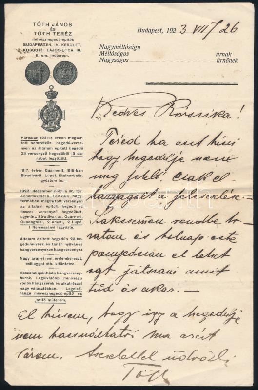 1923 Tóth János és Teréz művészhegedű építők reklámos levélpapír https://www.darabanth.com/hu/417-Gyorsarveres/417.0/Mutargy-papirregiseg-egyeb/Reklam~23/1923-Toth-Janos-es-Terez-muveszhegedu-epitok-reklamos-levelpapir~II2630706