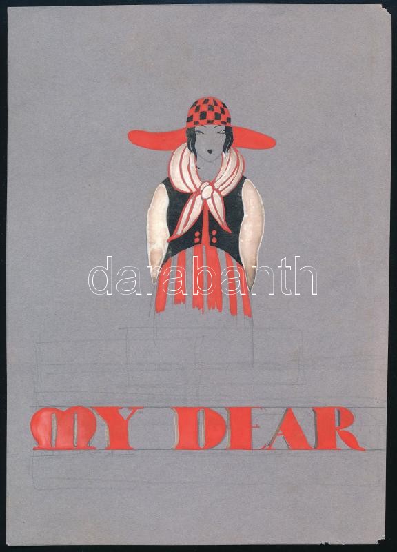 "My Dear" art deco reklám- vagy könyvborító terv, 1930 körül. Tempera, ceruza, papír. Jelzés nélkül, feltehetően Galambos Margit (?-?) grafikus alkotása. Jobb felső sarkában apró sérüléssel. 21x15 cm