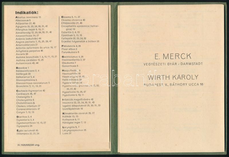 cca 1910 A német Merck gyár gyógyszerkészítményeinek magyar nyelvű ismertetője, kartonborítóban, Wirth Károly képviselő kiadványa, szép állapotban, 12 leporellóoldalon
