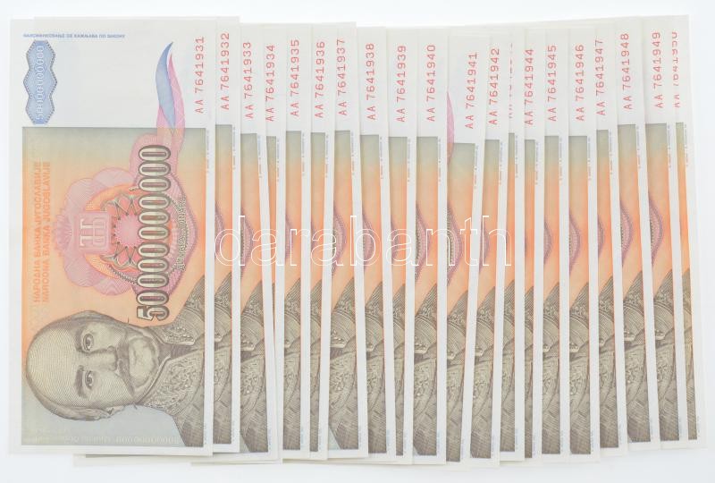 Yugoslavia 1993. 50.000.000.000 Dinara (20x) consecutive serials "AA 7641931 - AA 7641950" C:UNC,AU wavy paper