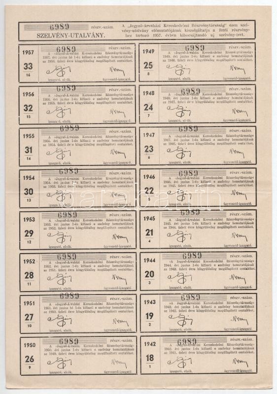 1941. "A Jegyző-Árvaházi Kereskedelmi Részvénytársaság" részvénye 16P-... https://www.darabanth.com/hu/417-Gyorsarveres/417.0/Numizmatika/Reszvenyek-es-sorsjegyek~2000004/1941-A-Jegyzo-Arvahazi-Kereskedelmi-Reszvenytarsasag-reszvenye-16P-rol-szelvenyekkel-~II2628810