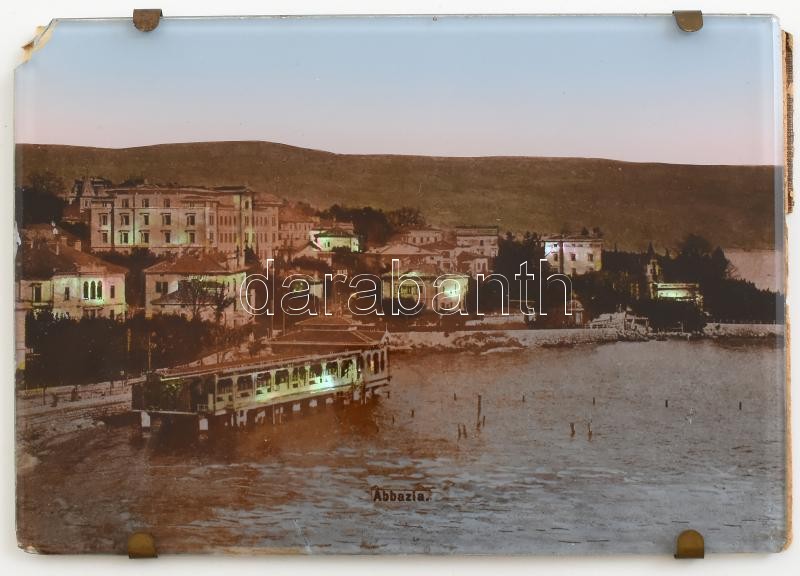Leírás: cca 1900 Abbázia: gyöngyház berakásos fotó, üvegre készítve. Sarkán kis hiány 14x10 cm