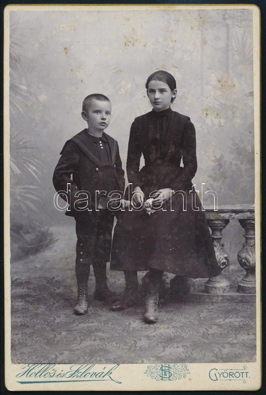 Leírás: cca 1900 Gyerekek műtermi portréja, keményhátú fotó Hollós és Szlovák győri műterméből, felületi sérülésekkel, 16×10,5 cm
