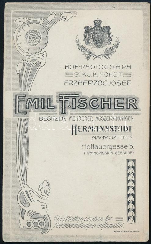 Leírás: cca 1910 Női portré, keményhátú fotó Emil fischer nagyszebeni műterméből, szecessziós hátlappal, 10,5×6,5 cm