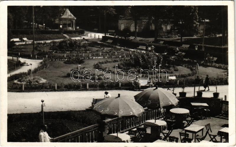1943 Borszék, Borsec; park, kávéház terasza Schmoll Pasta napernyőkkel. Heiter György fényképész eredeti felvétele / park, cafe's terrace with umbrellas (EK)