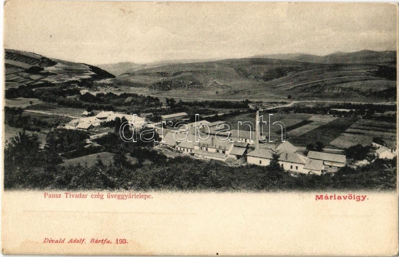 Leírás: Máriavölgy, Sárosmáriavölgy (Kőtelep, Kruzslyó, Kruzlov); Pausz Tivadar cég üveg gyár telepe. Divald Adolf 193. / glass factory