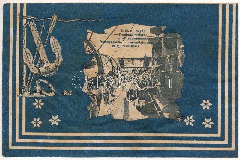 1909 SMS Árpád az Osztrák-Magyar Haditengerészet Habsburg-osztályú csatahajója, megszáradt ruhákat beviszik a matrózok / K.u.K. Kriegsmarine Schlachtschiff, Trockene Wäsche wird abgenommen / SMS Árpád Austro-Hungarian Navy Habsburg-class pre-dreadnought battleship, mariners taking the dry laundry. G. Fano Pola, 1907-08. Art Nouveau (r)