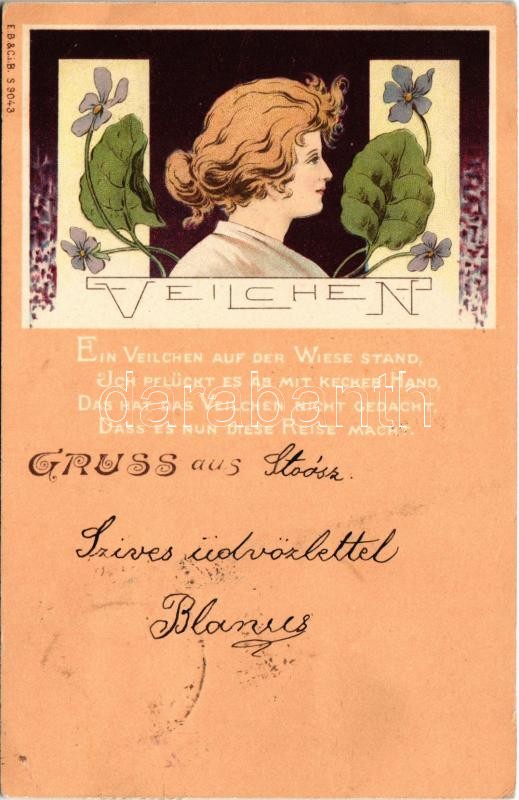 Leírás: 1899 (Vorläufer) Veilchen / Szecessziós hölgy ibolyákkal / Art Nouveau lady with violet flowers. E.B. & C.i.B. S. 9043. litho (EK)