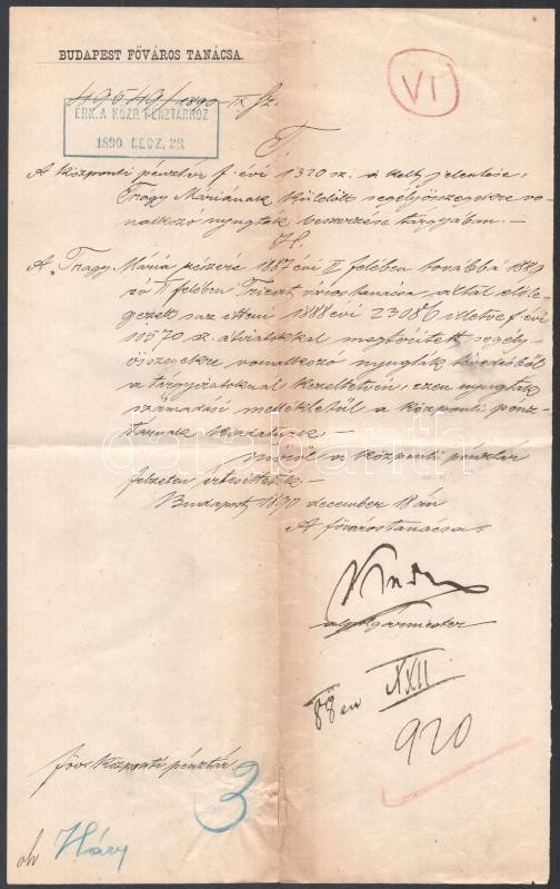 Leírás: 1890 Bp., Kada Mihály (1827-1894) budapesti alpolgármester aláírása okmányon
