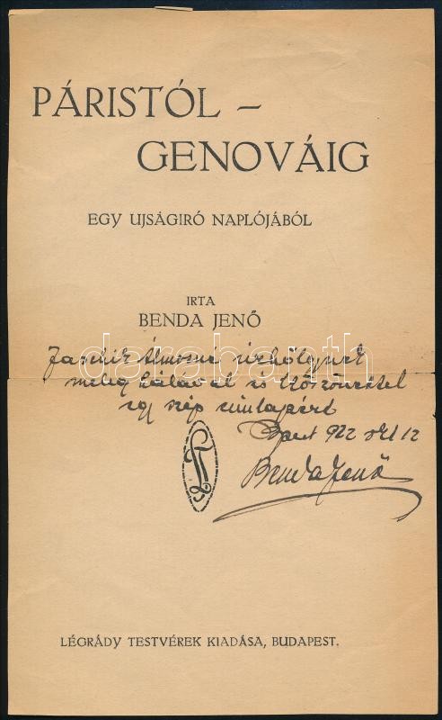 Leírás: Benda Jenő (1882-1944) író, újságíró dedikációja Jaschik Álmosné részére kiszedett könyvcímlapon
