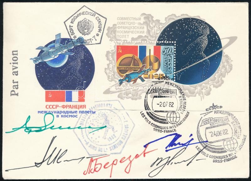 Leírás: Georgij Beregovoj (1921-1995) Alekszandr Volkov (1948- ), Szergej Krikaljov (1958- ), Valerij Poljakov (1942- ), Vlagyimir Tyitov (1947- ) Musza Manarov (1951- ) szovjet és Jean-Loup Chrétien (1938- ) francia űrhajósok aláírásai emlékborítékon / Signatures of Aleksandr Volkov (1948- ), Sergei Krikalev (1958- ), Valeriy Polyakov (1942- ), Vladimir Titov (1947- ) Musa Manarov (1951- ) Soviet and Jean-Loup Chrétien (1938- ) French astronauts on envelope