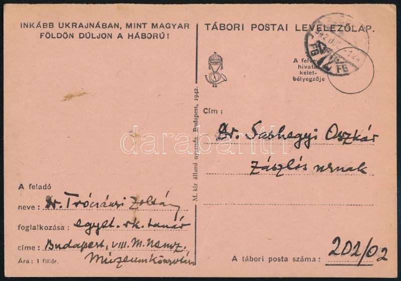 Leírás: Trócsányi Zoltán (1886-1971) nyelvész által írt tábori postai levelezőlap, Szemző Piroska és mások aláírásával