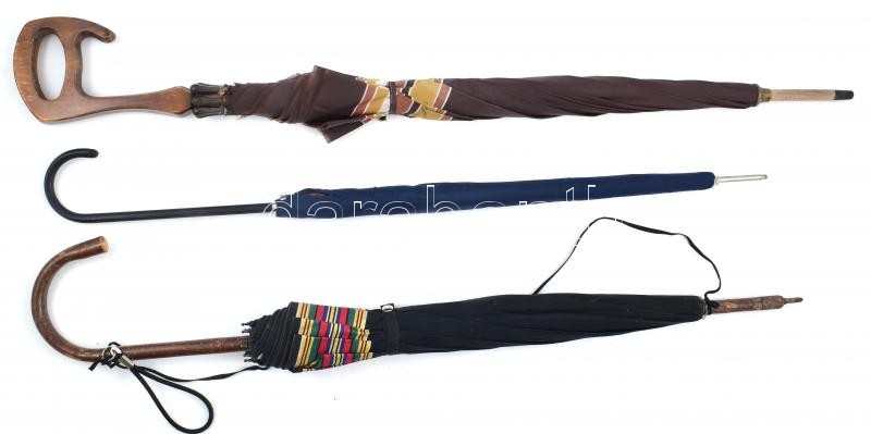 Leírás: 3 db régebbi esernyő (közte sétapálcás, fa nyelűek), változó állapotban (az egyik megkímélt, jó állapot), h: 81-94 cm
