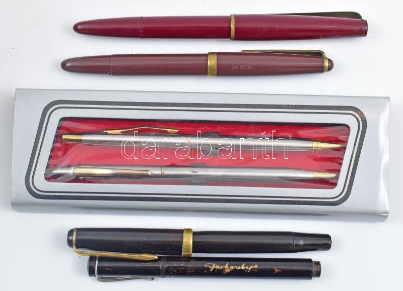 Leírás: 4 db töltőtoll, egyik hegy nélkül + golyóstoll és töltőceruza