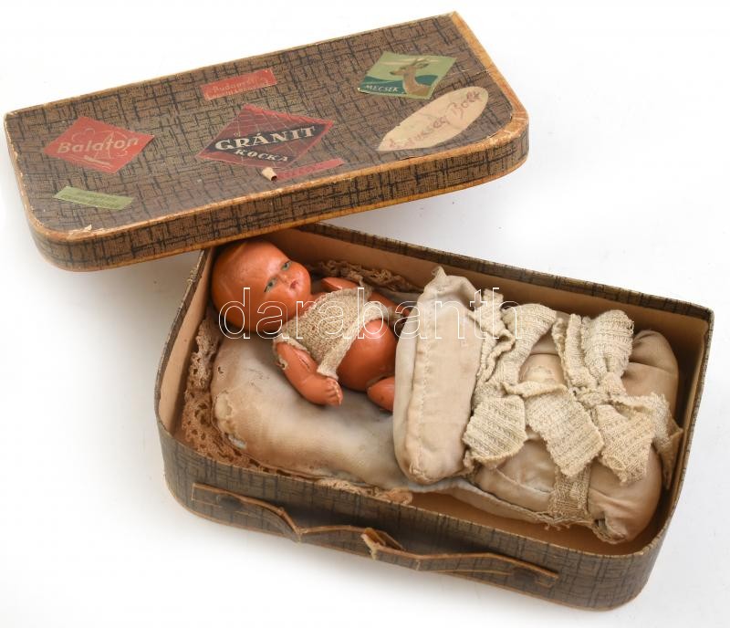 Leírás: Budapesti Csokoládégyár bőrönd formájú papírdoboz, benne kis festett kerámia baba, kissé sérült, 14x8x4 cm