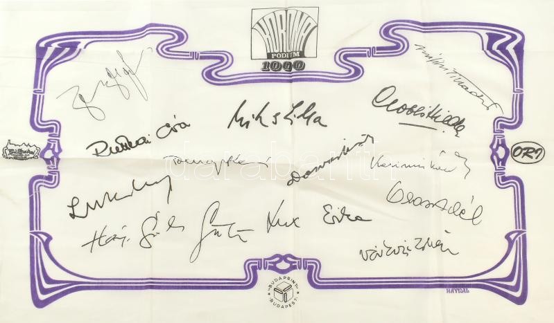 Korona Pódium 1000 emlékkendő, rajta a fellépő színészek és színésznők nyomtatott aláírásaival: Mikes Lilla (alapító, művészeti vezető), Ruttkai Éva, Harsányi Gábor, Gobbi Hilda, Bilicsi Tivadar, Várkonyi Zoltán, Lux Erika, Orosz Adél, stb., 70x45 cm