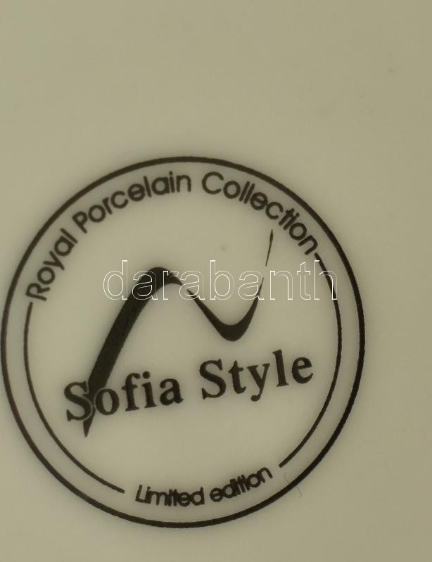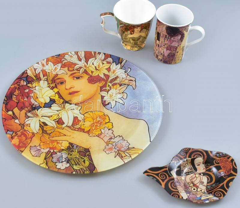 Leírás: Mucha és Klimt dekorral ellátott tál, üveg, d: 30 cm , bögrék, porcelán. Matricás, jelzett.