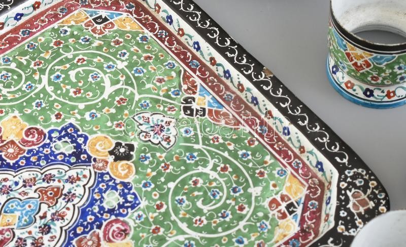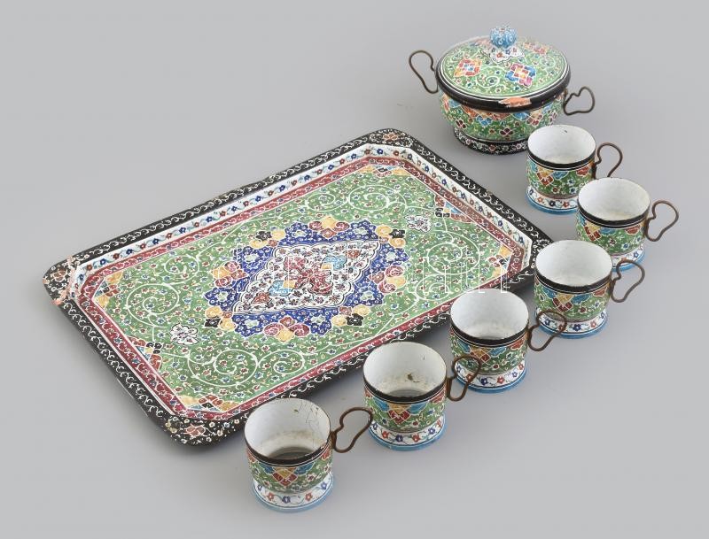 Leírás: Perzsa zománcozott tálca + 6 db pohártartó talp + cukortartó (egyik füle sérült), zománclepttanásokkal, kopásnyomokkal