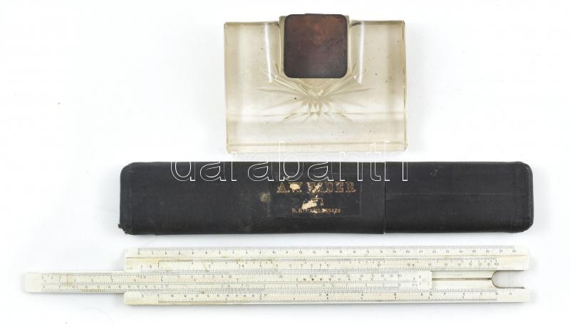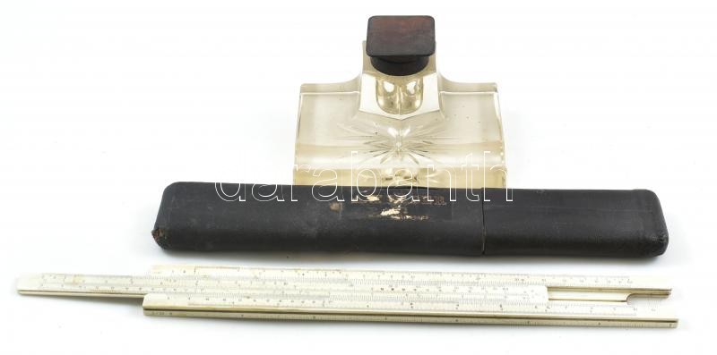 Leírás: Régi asztali tintatartó, csiszolt, metszett üveg, fém fedéllel, 13,5x9,5x8 cm + logarléc, tokban, h: 30 cm. Koruknak megfelelő állapotban.