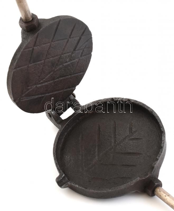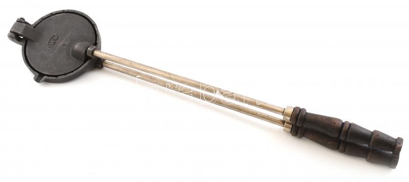 Leírás: Régi öntöttvas, fém, fa, ostyasütő, kopott, h: 58 cm
