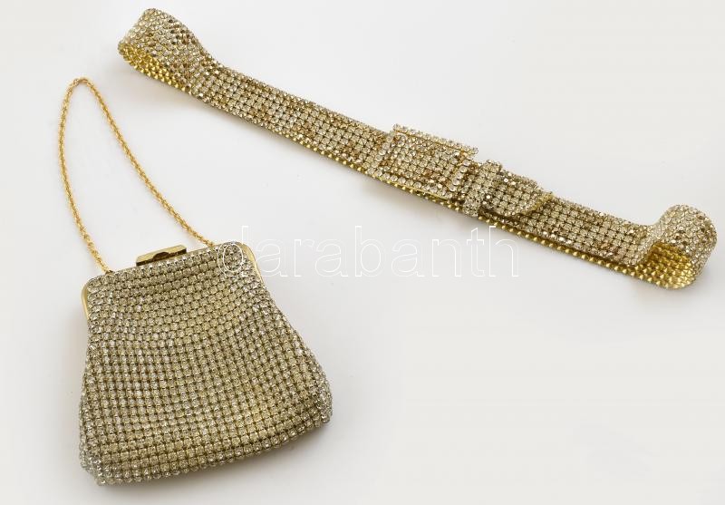 Leírás: Strasszos bizsu ékszerszett táskával, kis kopásnyomokkal