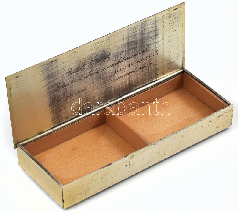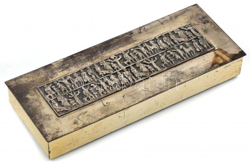 Leírás: Tevan Margit dombornyomott fém asztali kártyadoboz Jelzett, 21x8 cm
