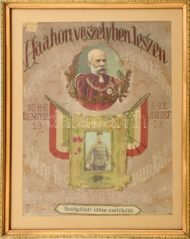 1903 Nevesített magyar katonai emléklap, Ferenc József nyomat arcképével, katona fotójával, nemzeti színű szalagokkal, sérült. Dekoratív üvegezett fakeretben, 39x28,5 cm