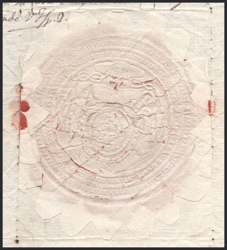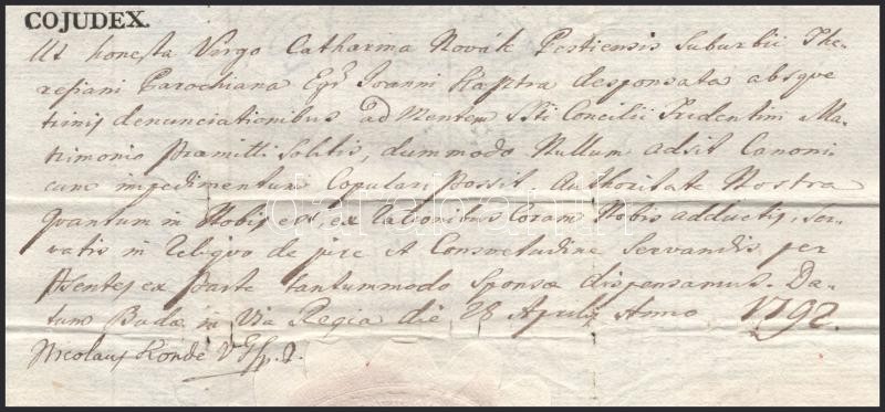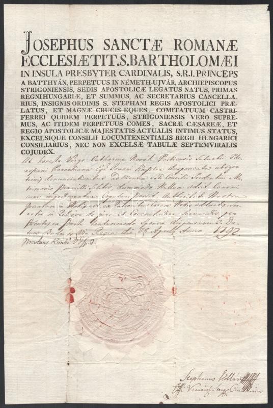 1792 Pókateleki Kondé Miklós (1730-1802) nagyváradi római katolikus püspök. Autográf aláírással ellátott okmánya. nagy méretű papírfelzetes viaszpecséttel