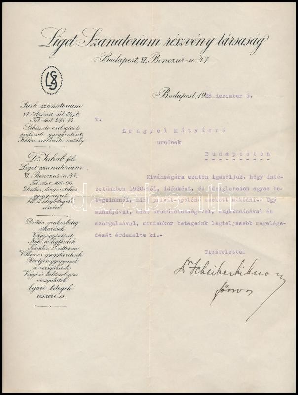 1928 A Liget Szanatórium Rt. fejléces levélpapírja dr. Scheiber főorvo... https://www.darabanth.com/hu/418-Gyorsarveres/418.0/Mutargy-papirregiseg-egyeb/Okmanyok~500018/1928-A-Liget-Szanatorium-Rt-fejleces-levelpapirja-dr-Scheiber-foorvos-alairasaval~II2640230
