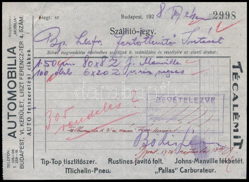 1928 Bp., Automobilia autófelszerelés cikkek fejléces számla https://www.darabanth.com/hu/418-Gyorsarveres/418.0/Mutargy-papirregiseg-egyeb/Okmanyok~500018/1928-Bp-Automobilia-autofelszereles-cikkek-fejleces-szamla~II2640228