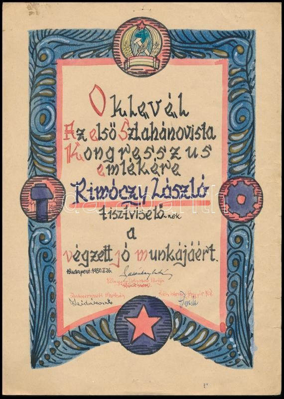 Leírás: 1950 Első Sztahánovista kongresszus rajzolt emléklapja 20x30 cm