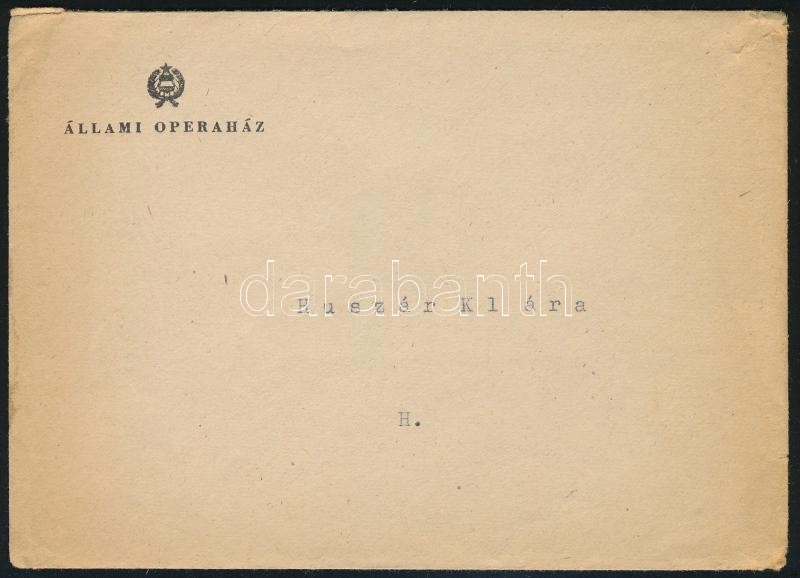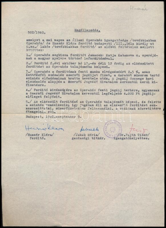 Leírás: 1960 Debreczeniné Huszár Klára (1919-2010) operarendező, műfordító szerződése az Állami Operaházzal