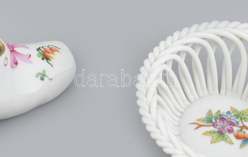 Leírás: Herendi vegyes porcelán tétel, cipő, fonott kosár, tálka, kopásnyomokkal.