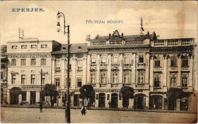 1907 Eperjes, Presov; Fő utca, Gyógyszertár, Elefánt kávéház, üzletek.... https://www.darabanth.com/hu/419-Gyorsarveres/419.0/Kepeslapok/Felvidek~1500007/1907-Eperjes-Presov-Fo-utca-Gyogyszertar-Elefant-kavehaz-uzletek-Fenynyomat-Divald-mC5~II2650377