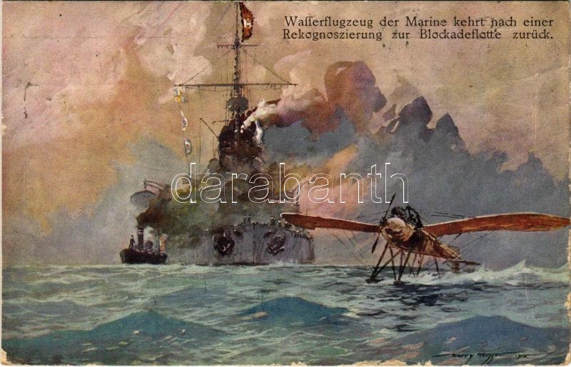 1915 Wasserflugzeug der Marine kehrt nach einer Rekognoszierung zur Blockadeflotte. K.u.K. Kriegsmarine. Offizielle Postkarte des Österreichischen Flottenvereines zu Gunsten der Kriegsfürsorge / Osztrák-magyar haditengerészeti flotta és hidroplán / Austro-Hungarian Navy seaplane and fleet s: Harry Heusser