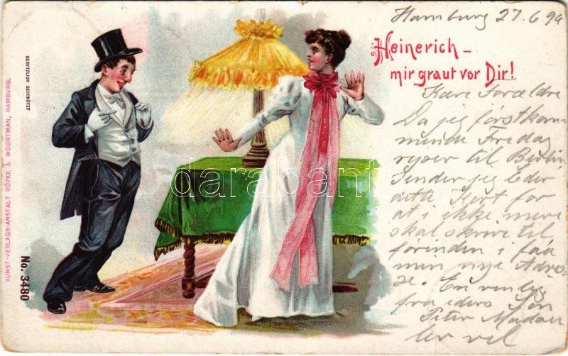 Leírás: 1899 (Vorläufer) Heinerich - mir graut vor Dir! / Lady art postcard, romantic couple, humour. Art Nouveau, litho (kis szakadás / small tear)