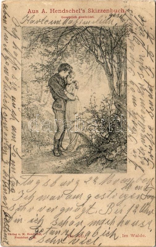 Leírás: 1900 Im Walde. Aus A. Hendschel's Skizzenbuch / Lady art postcard, romantic couple (fa)
