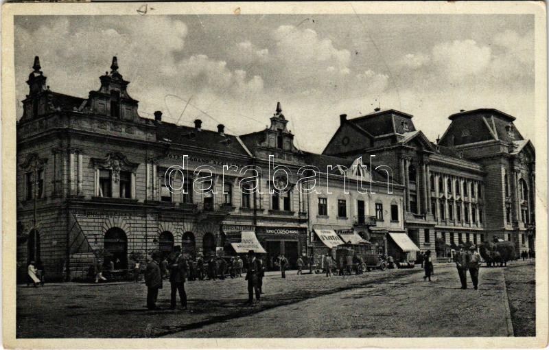 1938 Beregszász, Beregovo, Berehove; Hotel Grand a okresní soud / Grand Szálloda és Járásbíróság, Corso kávéház és mozi, Dobos parfüméria, Bata cipő üzlet / hotel, district court, café, cinema, perfumery, shoe store, shops + "1938 Beregszász visszatért" So. Stpl. (Rb)