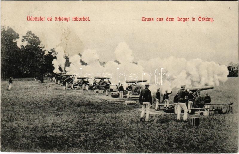 Leírás: 1909 Üdvözlet az örkényi táborból / Gruss aus dem Lager in Örkény / Austro-Hungarian K.u.K. military camp, artillery practice (EK)