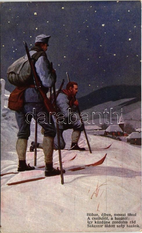 Hóban, éjben, messzi távol a családtól, a hazától... A Szent István Társulat háborús képeskártyáinak karácsonyi sorozata / WWI Austro-Hungarian K.u.K. military art postcard, soldiers with ski