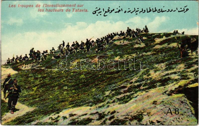 Les troupes de l'Investissement sur les hauteurs de Tatavla / Turkish military, group of soldiers. Editeur Max Fruchtermann (Constantinople) (kis szakadás / small tear)