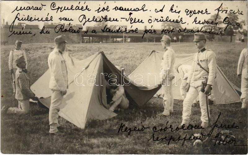 Osztrák-magyar katonák csoportja sátorállítás közben, háttérben tábori vasút / Austro-Hungarian K.u.K. military, group of soldiers with tents, field railway in the background. photo (EK)