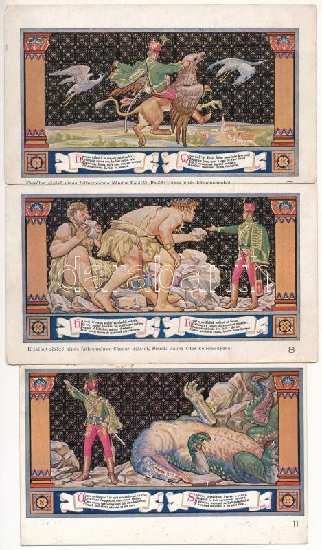 Budapest V. Egyetem utca 5. Erzsébet Királyné Szálló étterem és söröző pince, Sándor Béla falfestménye Petőfi Sándor János vitézéből - 3 db régi képeslap