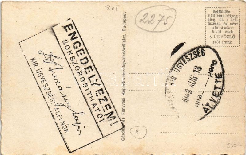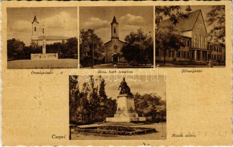 Budapest XXI. Csepel, országzászló, Hősök szobra, községháza, római katolikus templom. Hátoldalon Kir. Ügyészségi Alelnök Engedélyezem! Sokszorosítható!
