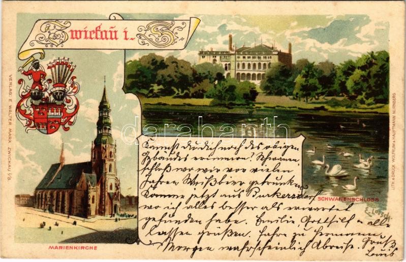 Leírás: Zwickau, Marienkirche, Schwanenschloss / church, swan lake with castle. Verlag E. Walter Marx Art Nouveau, litho with coat of arms (fl)