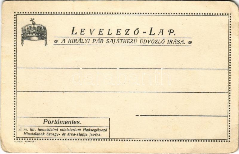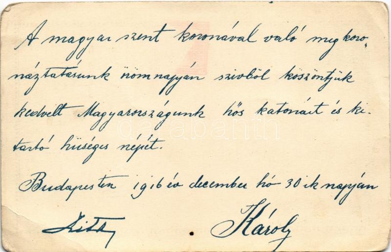 IV. Károly és Zita. A királyi pár saját kezű üdvözlő írása. IV. Károly koronázásának napján / Written greeting of Charles I of Austria and Queen Zita, on the day of the coronation of Charles (kopott sarkak / worn corners)