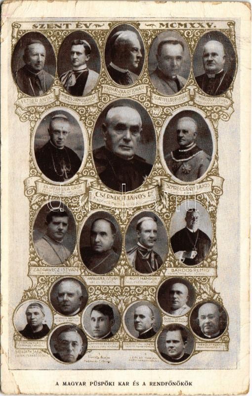 A Magyar Püspöki Kar és a rendfőnökök; Dr. Csernoch János bíboros-hercegprímás, Prohászka Ottokár püspök, Zichy Gyula gróf, Szmrecsányi Lajos érsek, Zadravecz István tábori püspök, stb. Az 1925-ös Szent év alkalmából kiadott képeslap; hátoldalon Nemzeti Újság reklám / Hungarian Catholic Bishops' Conference (EB)