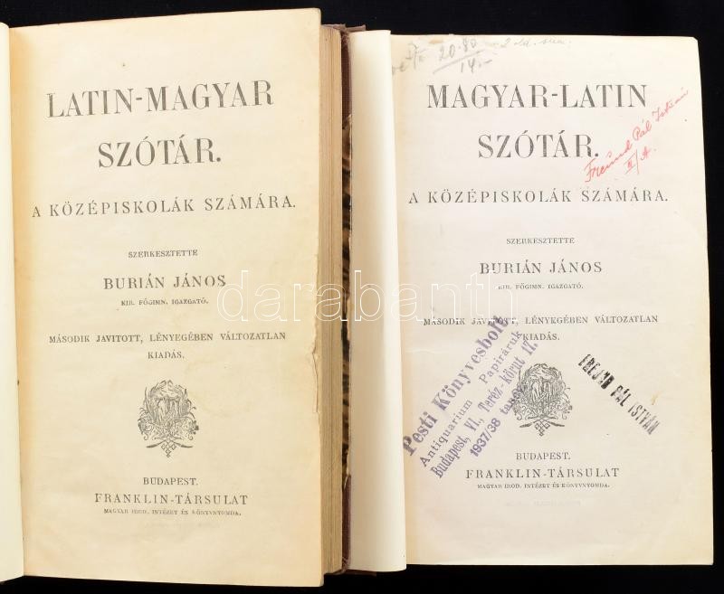 Burián János: Magyar-latin és latin-magyar szótár a középiskolák számá... https://www.darabanth.com/hu/419-Gyorsarveres/419.0/Konyvek/Konyvek-Egyeb-ritkasagok~1000022/Burian-Janos-Magyar-latin-es-latin-magyar-szotar-a-kozepiskolak-szamara-Bp-Franklin-~II2648575